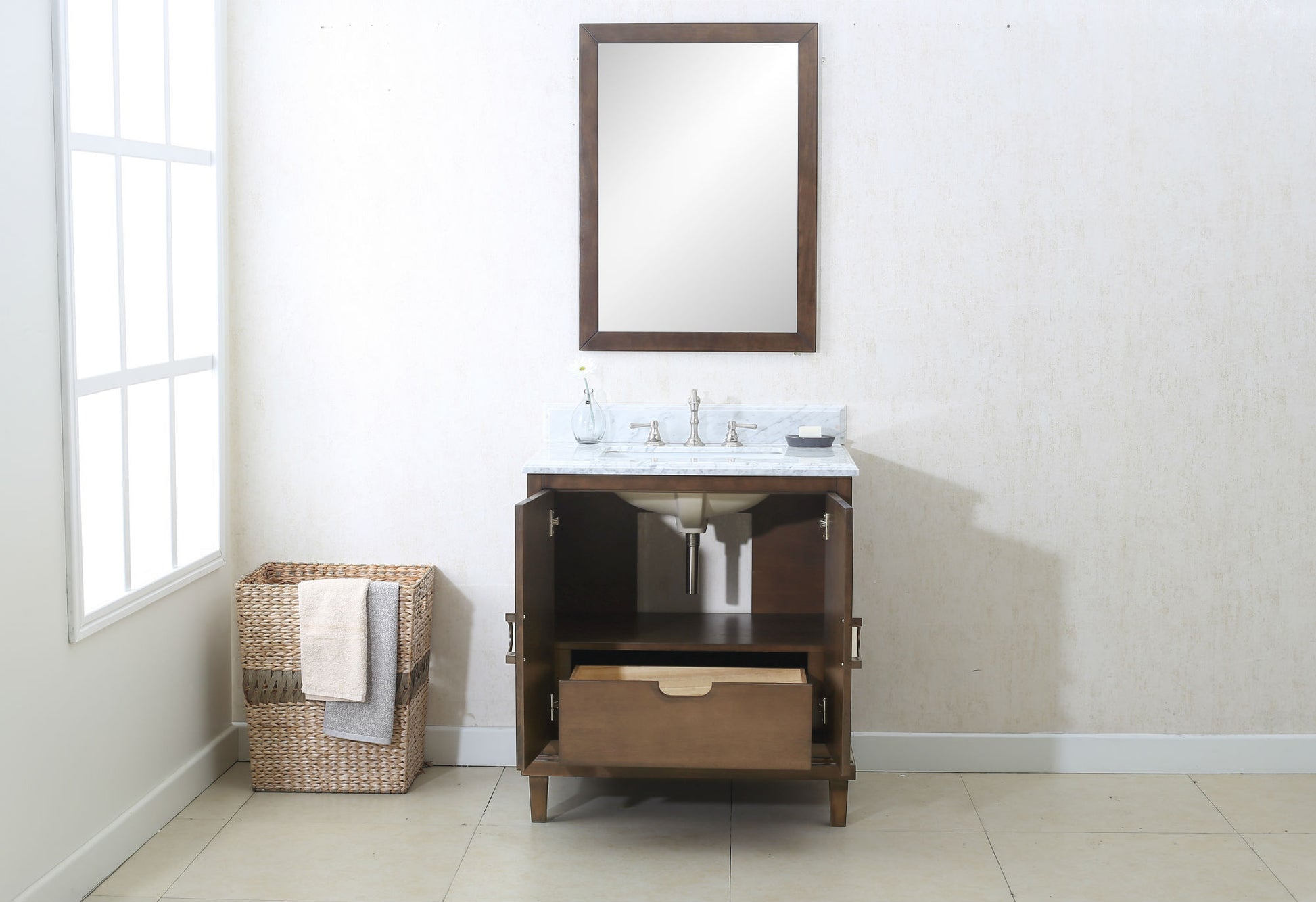 This 30" Antique Coffee Single Vanity Sink is the perfect statement piece to upgrade any mid-century modern bathroom. Its antique coffee finish creates a polished yet vintage feel, while its Carrara Marble countertop adds a touch of timelessness. Upgrade your bathroom today!