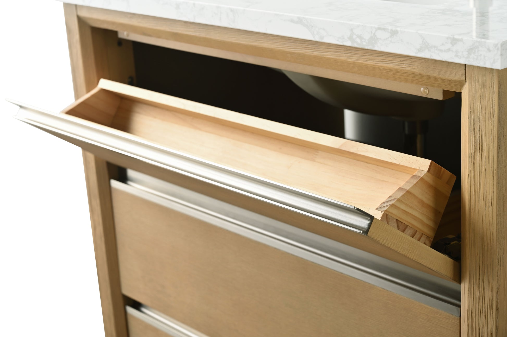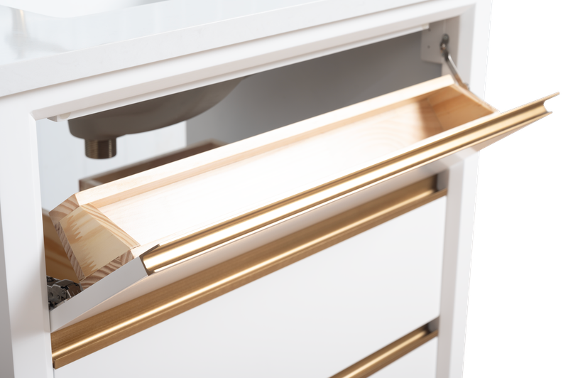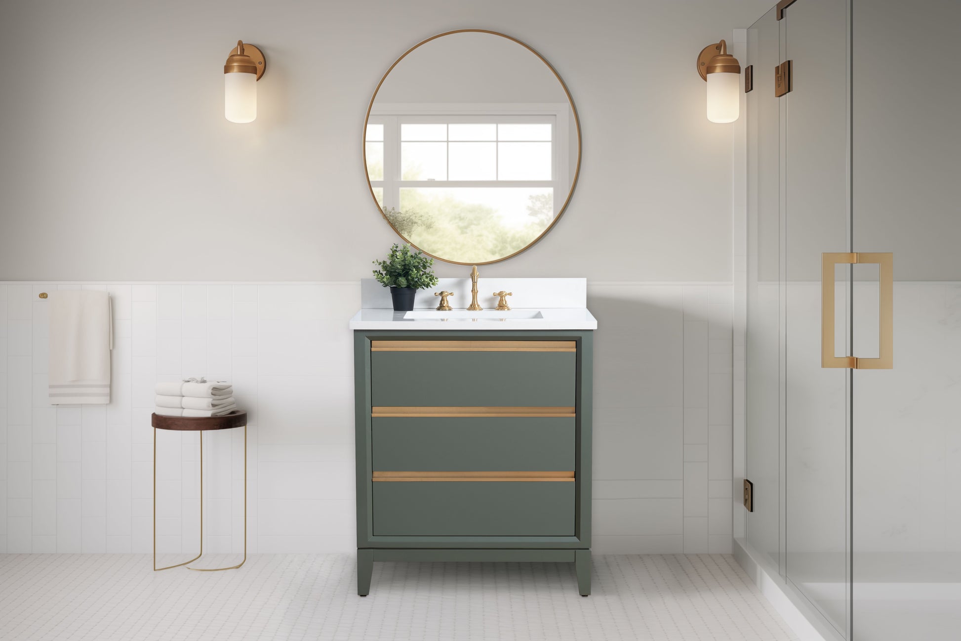 With its 30 inch size, single sink, and spacious drawer storage, the Lindsay Vanity offers the perfect combination of functionality and style. Its color and metal hardware accents bring a touch of elegance to any bathroom, while the engineered stone vanity top ensures durability. Blending modern and classic design, this vanity is a must-have for any upgraded bathroom design.