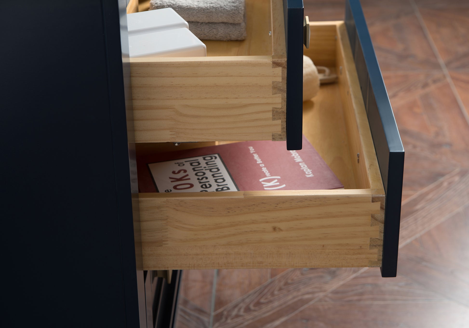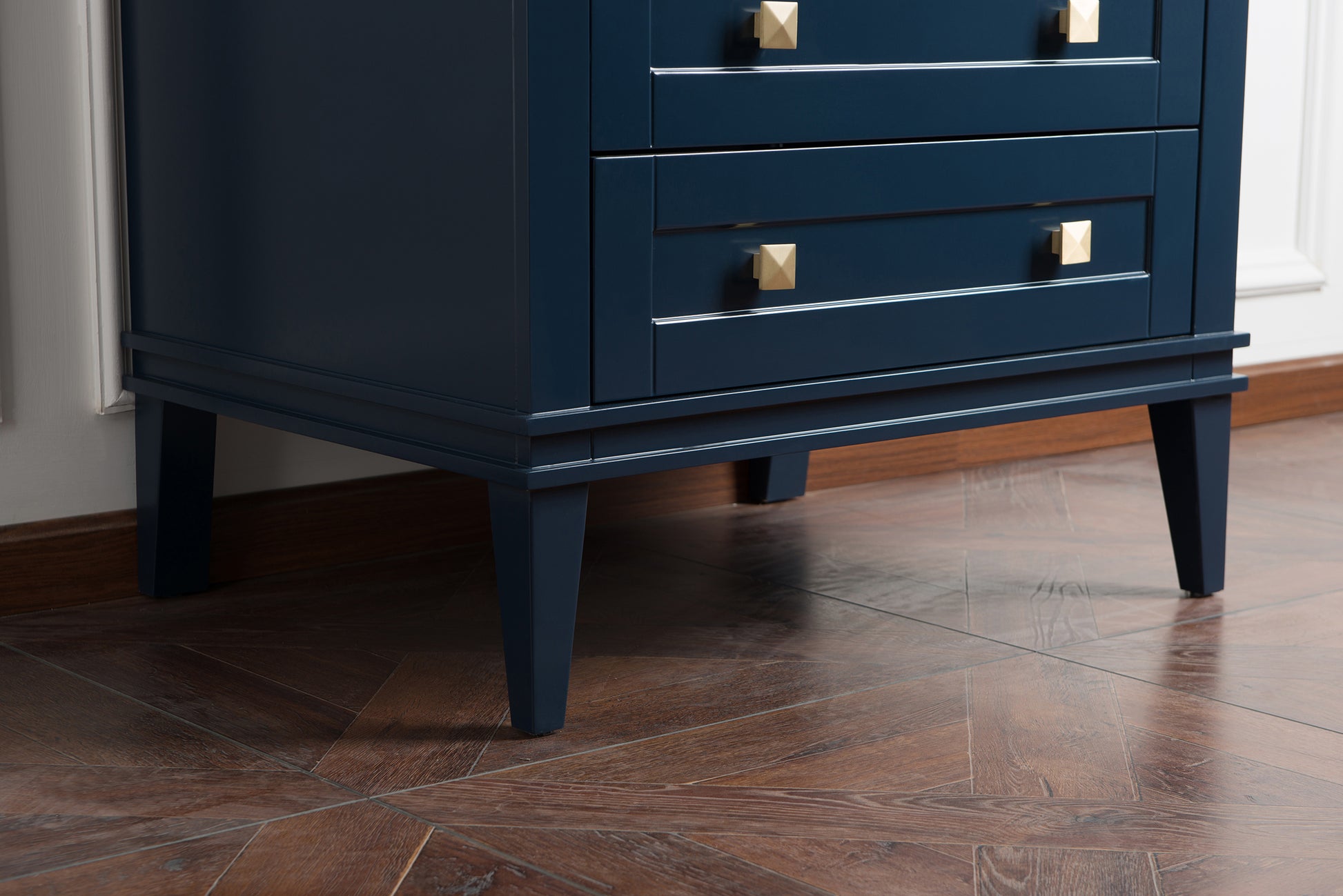 This 30" single vanity is an ideal choice for those looking for an elegant statement piece. The navy blue finish complements the gold hardware and Carrara Marble countertop, resulting in a stunning combination. The drawers provide plenty of storage space for bathroom essentials.