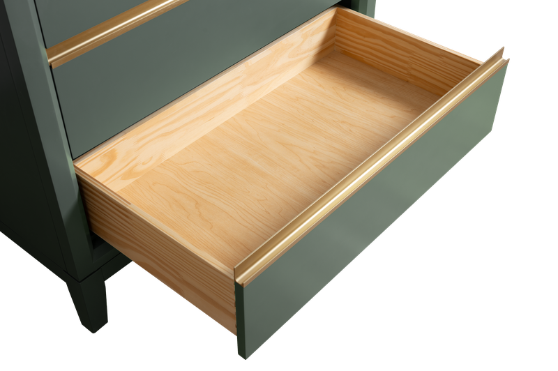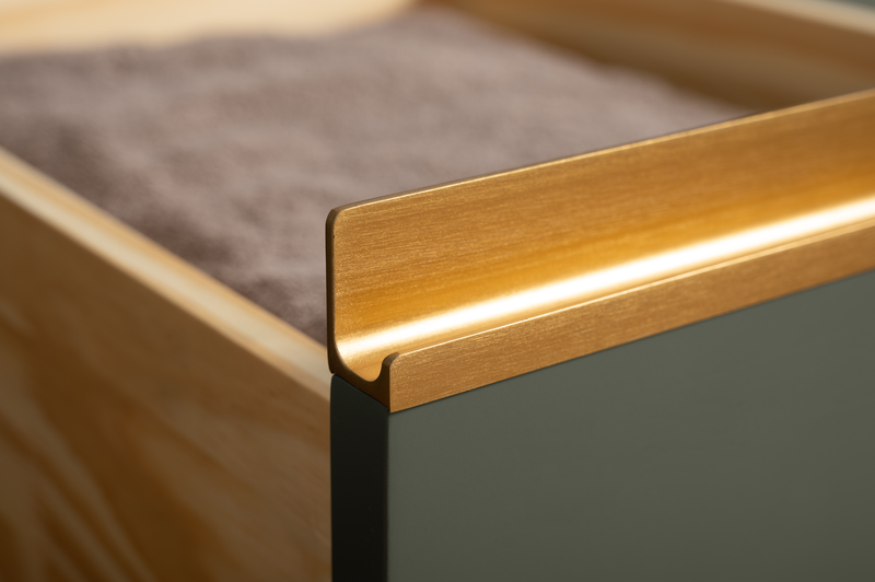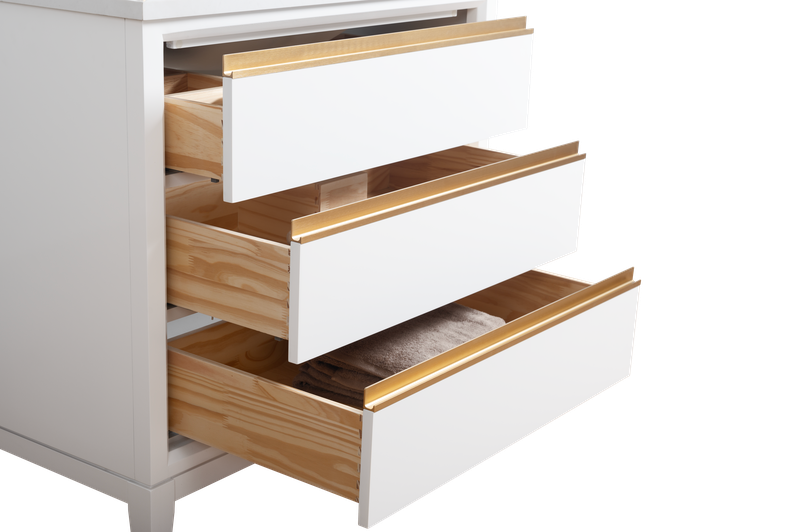 - gold metal hardware the length of the drawers