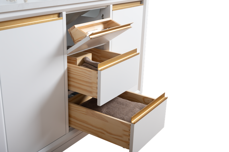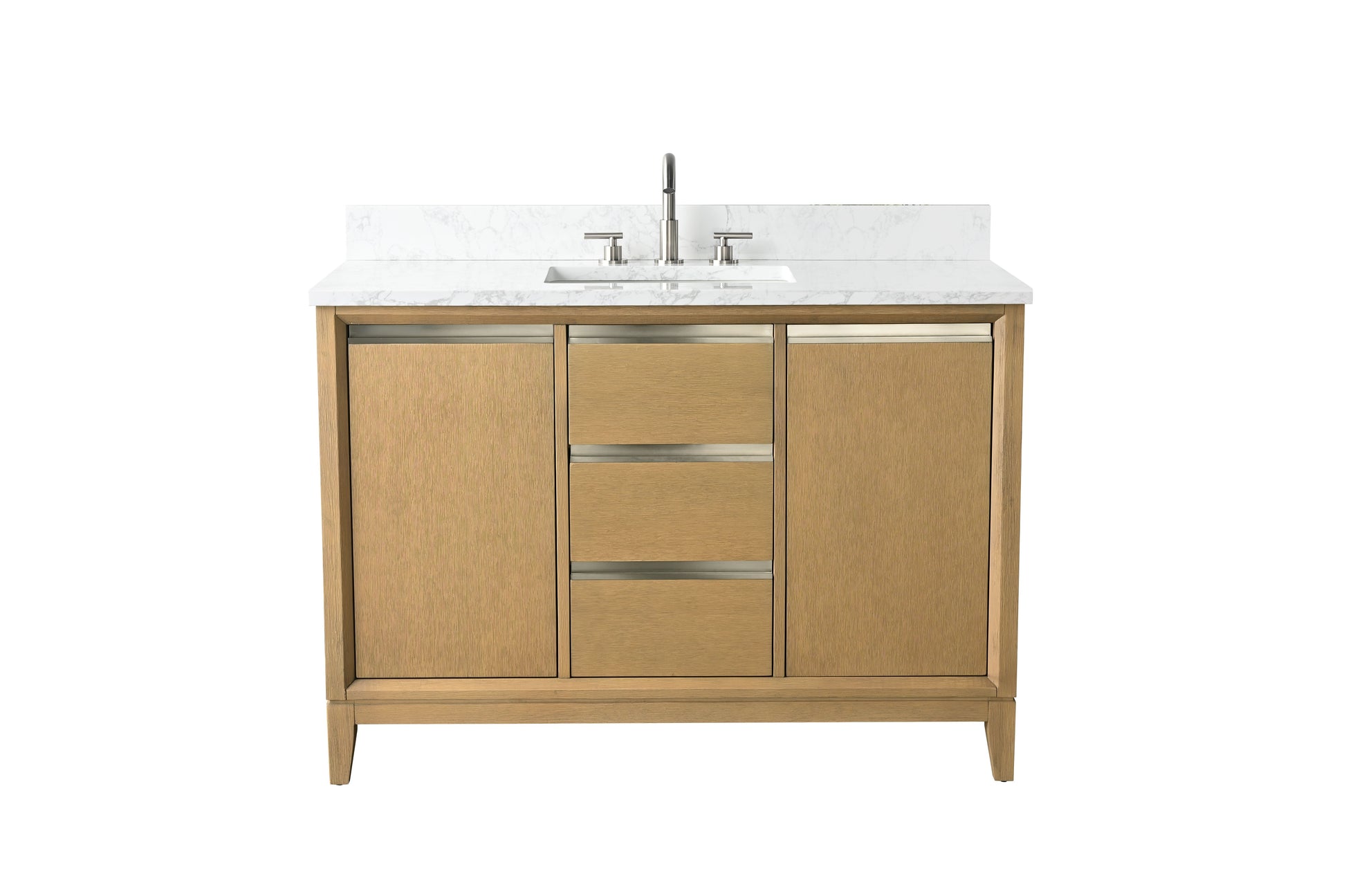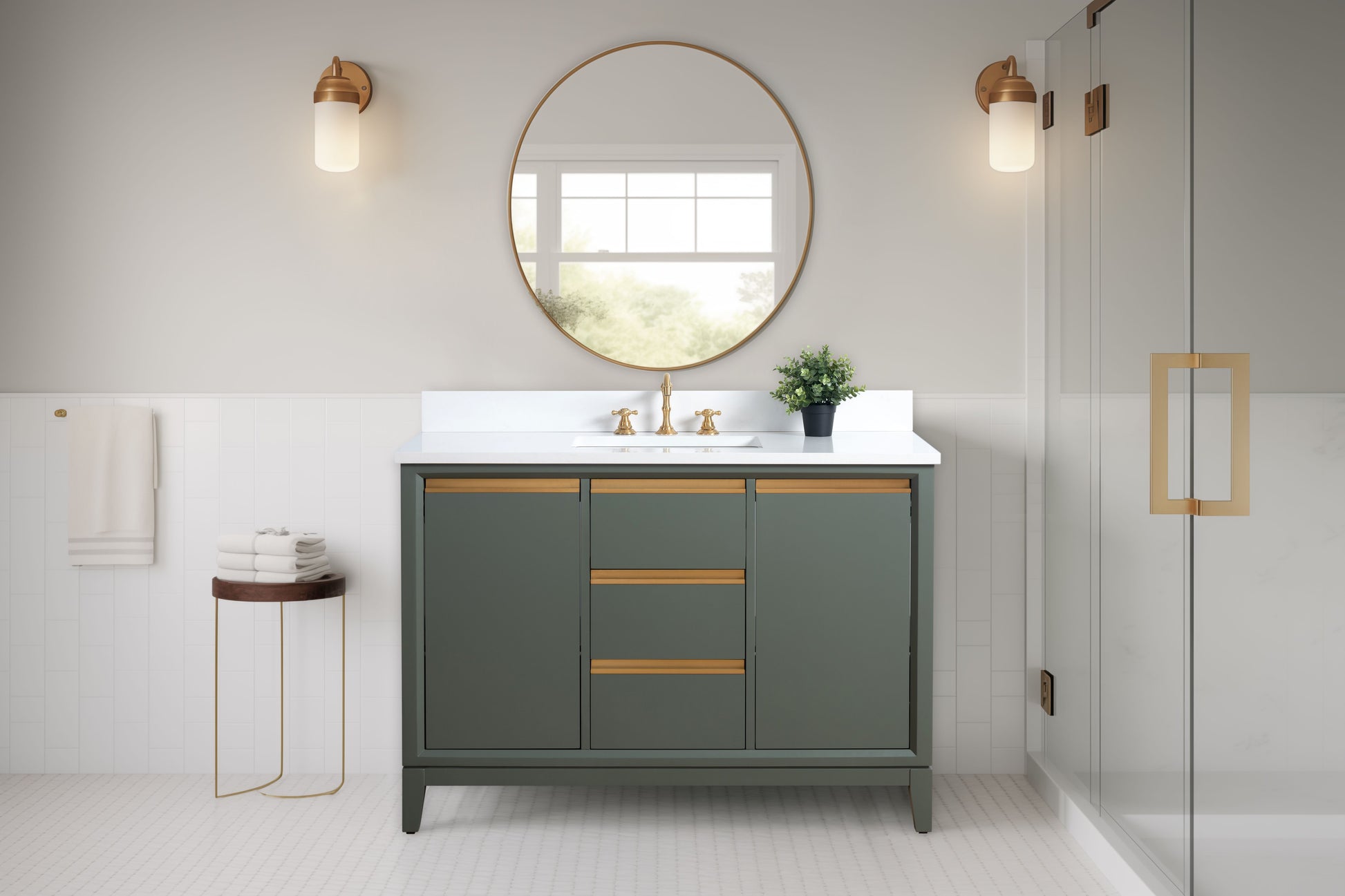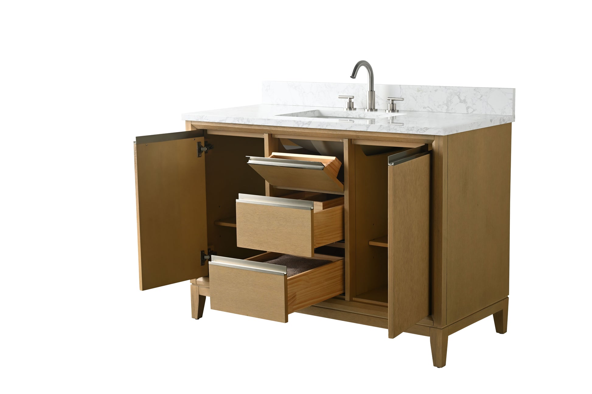With its 48 inch size, single sink, and spacious drawer and under sink door storage, the Lindsay Vanity offers the perfect combination of functionality and style. Its color and metal hardware accents bring a touch of elegance to any bathroom, while the engineered stone vanity top ensures durability. Blending modern and classic design, this vanity is a must-have for any upgraded bathroom design.