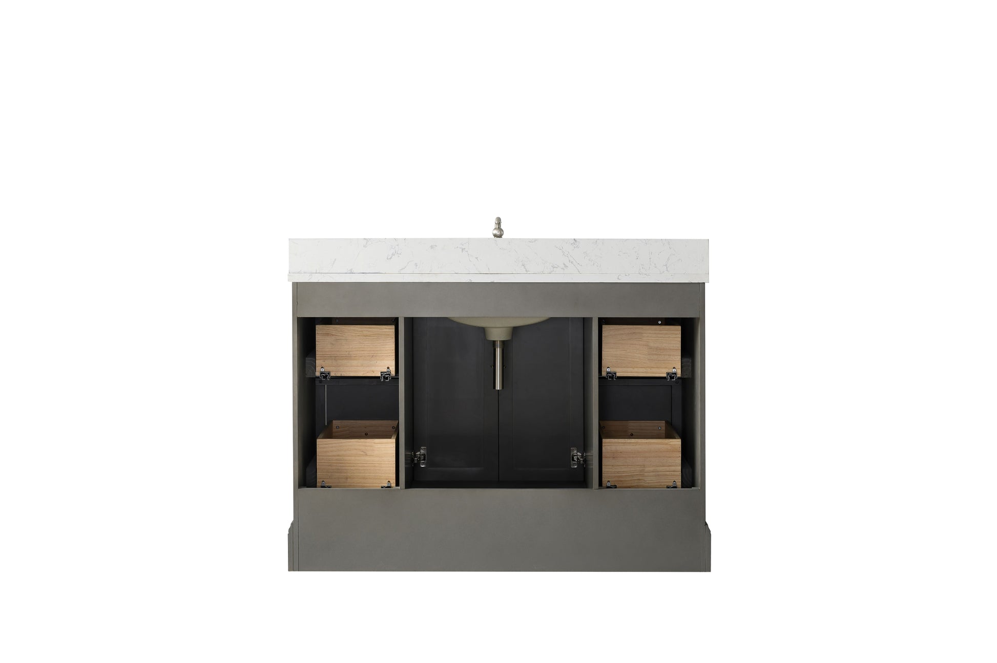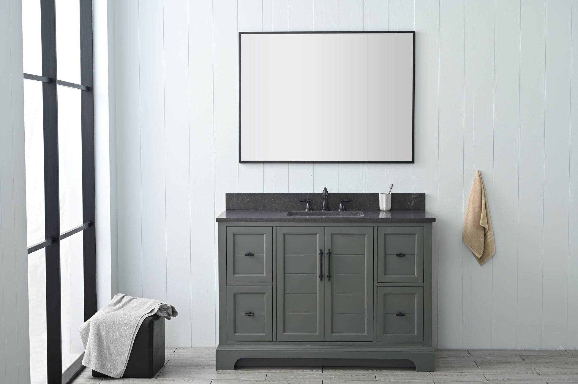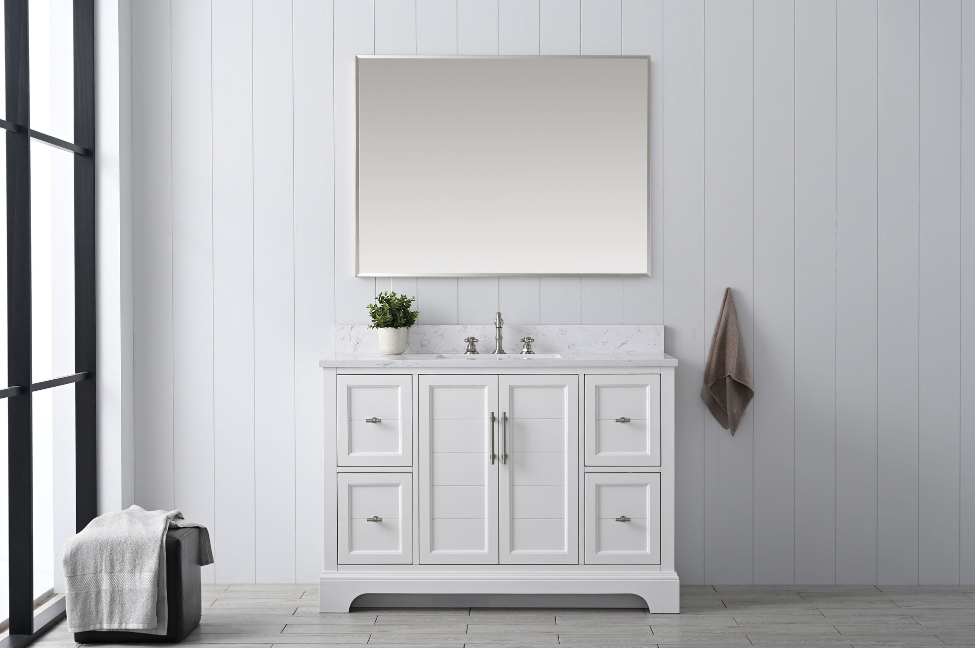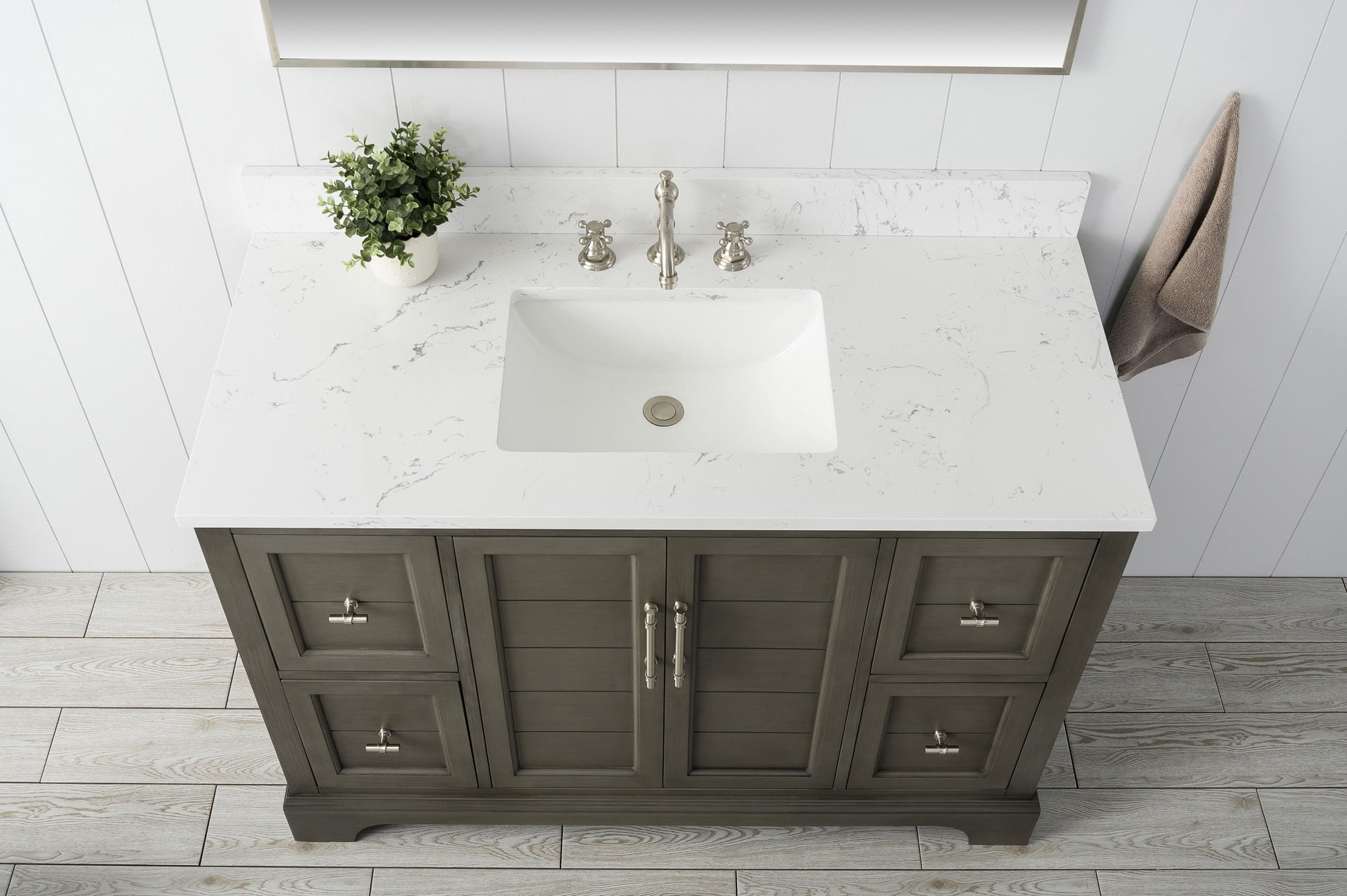 This 48" Modern Farmhouse vanity features a ship-lap texture and lacquer finish for an elegant and on-trend look. The single undermount sink and stone countertop offer superior durability and easy maintenance. Soft close hinges add the perfect finishing touch.