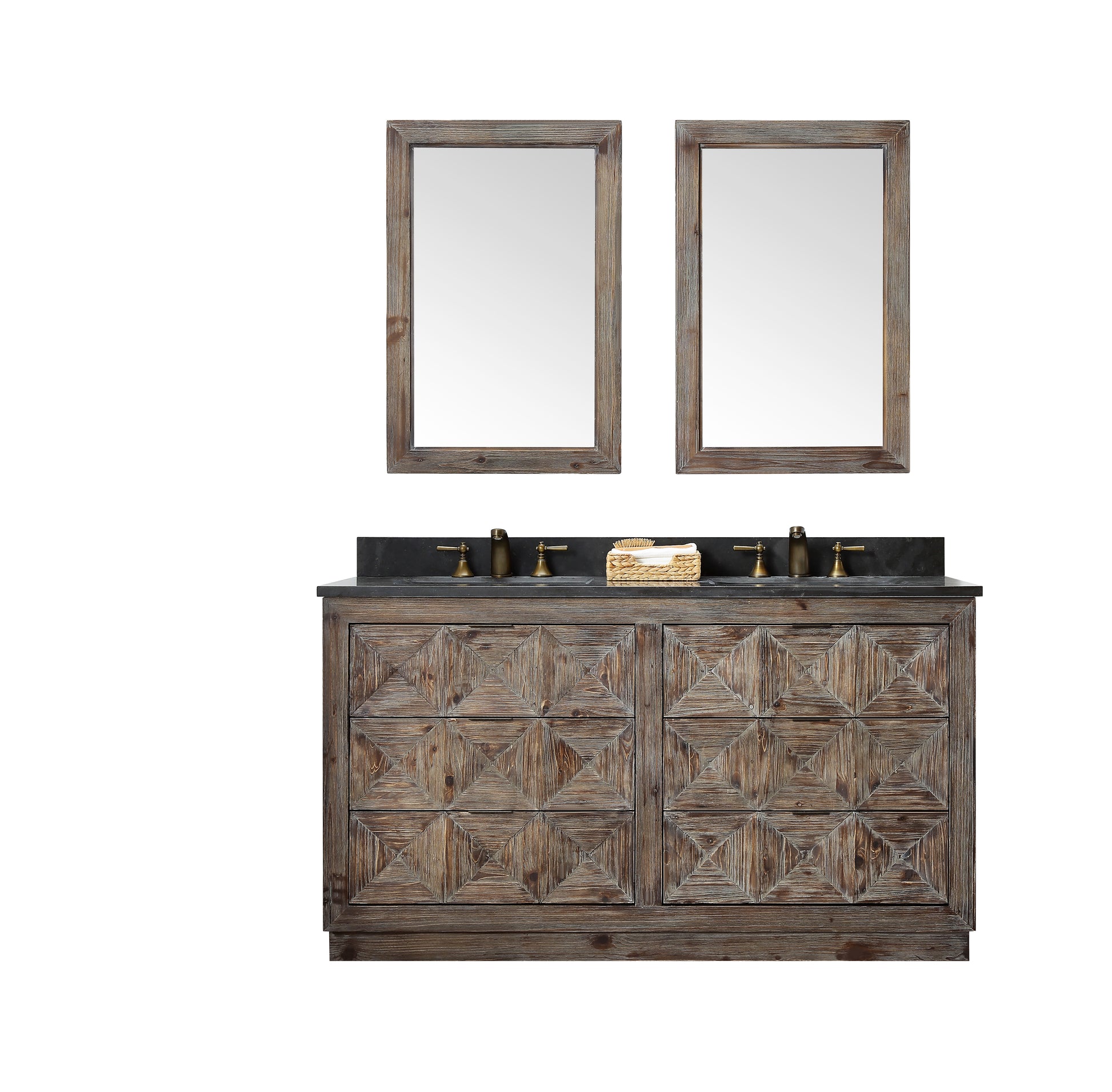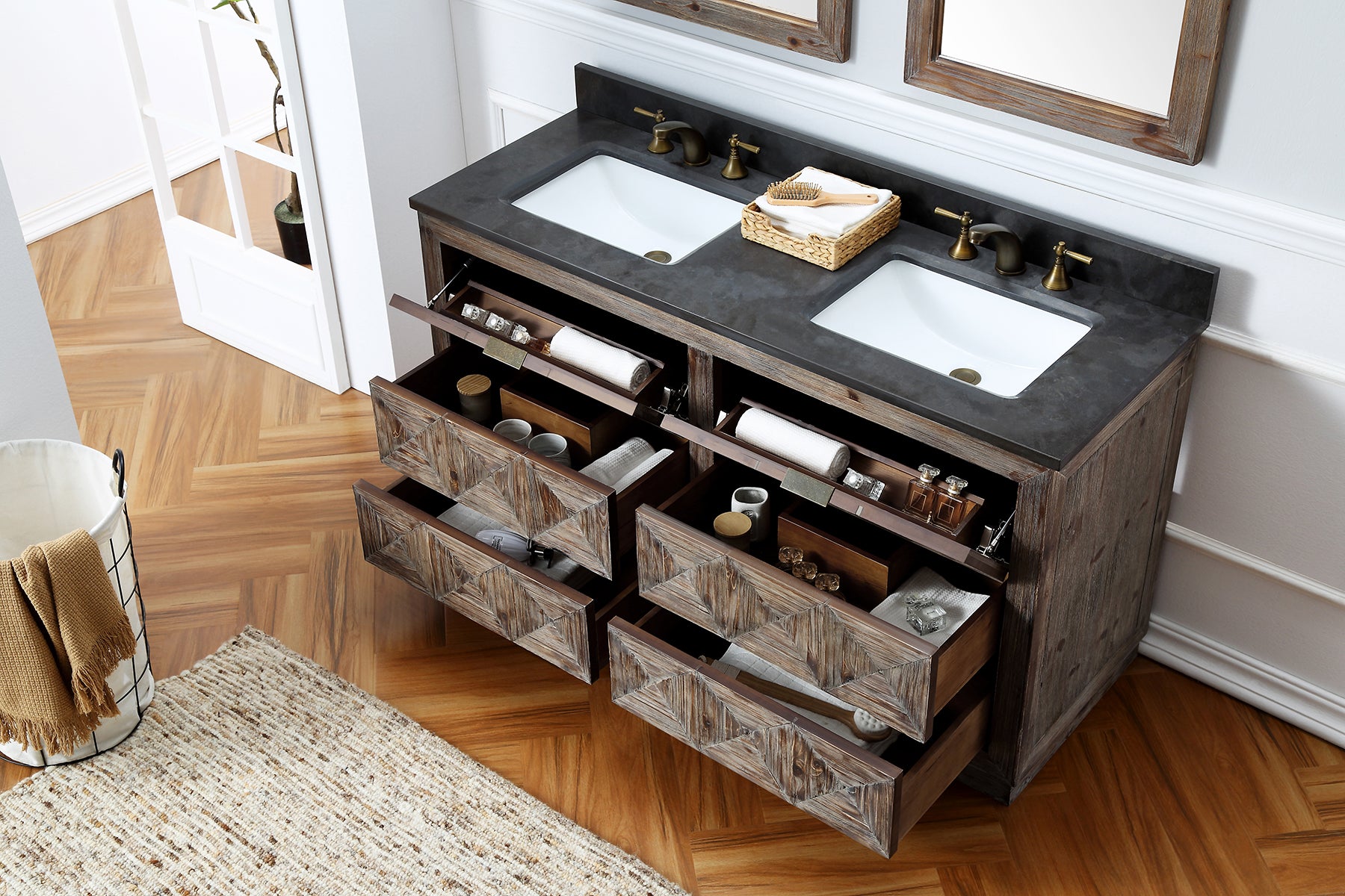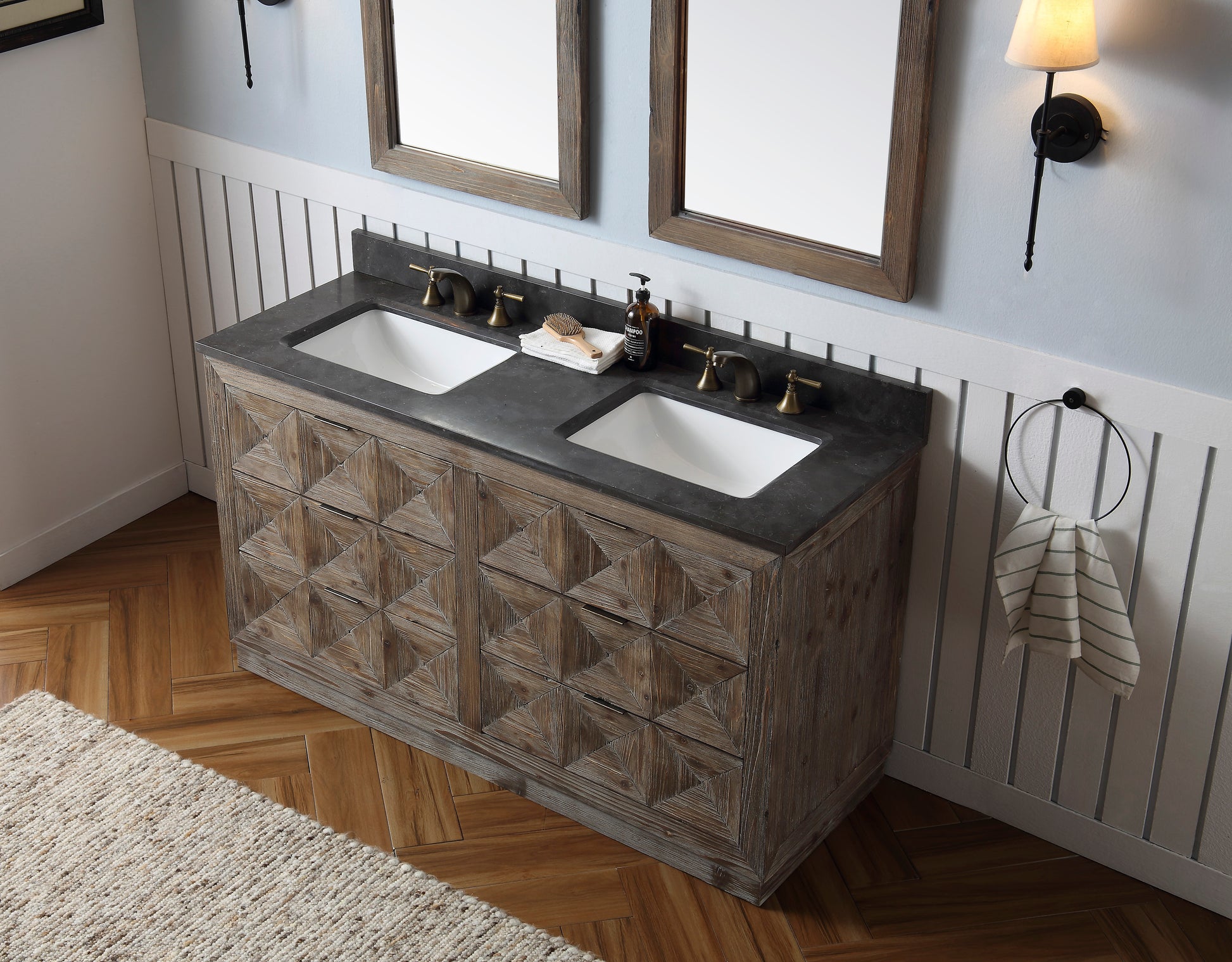 A timeless addition to any bathroom, this 60" ANTIQUE BRONZE WOOD SINK VANITY is crafted from fir wood and a moon stone countertop to provide an elegant contrast. Featuring double ceramic white sinks and a beautiful antique bronze finish, this vanity is sure to become a signature piece in your home.