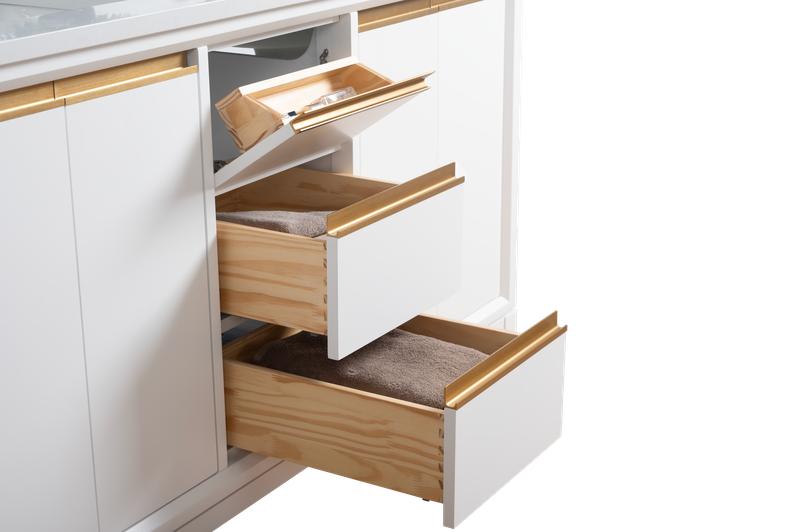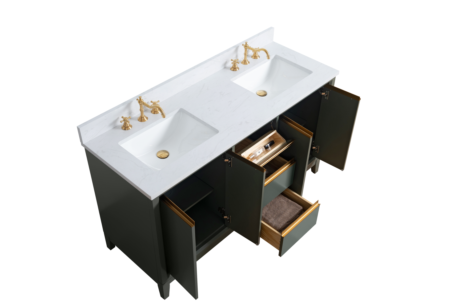 Maximize your bathroom space with the 60 inch Lindsay Double Vanity. With a spacious engineered marble countertop and soft close hinges, this double sink vanity offers ample storage options. Choose from multiple color options to complement any bathroom design. Expertly crafted with porcelain sinks and sleek metal hardware.