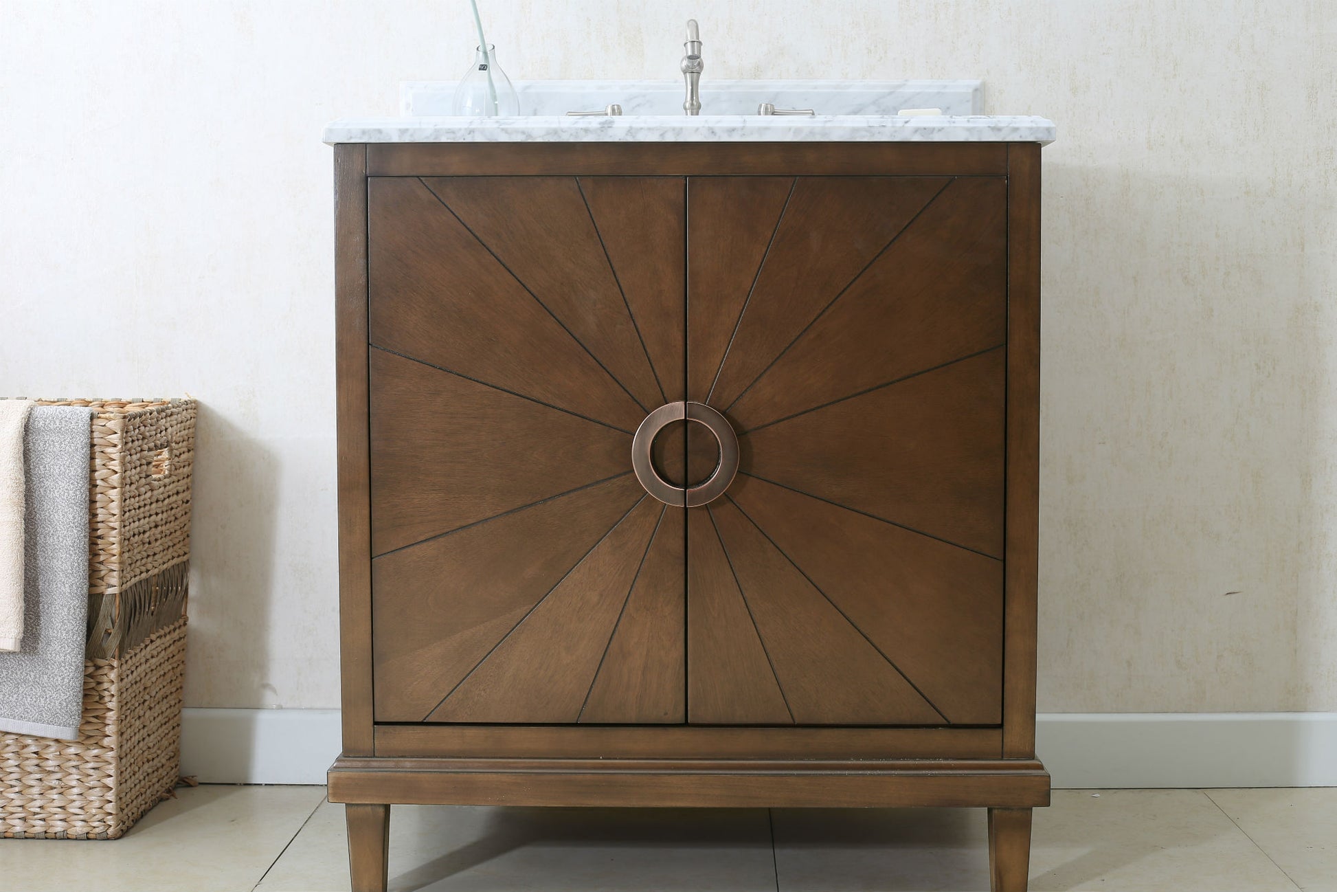 This ANTIQUE GRAY OAK VANITY is made with a unique mid-century modern design and a stunning stone top. Crafted with a long-lasting poplar and durable materials, this vanity will add classic beauty to any bathroom. Enjoy functionality and style with a timeless piece of furniture. Comes in multiple sizes, with two countertop color options.